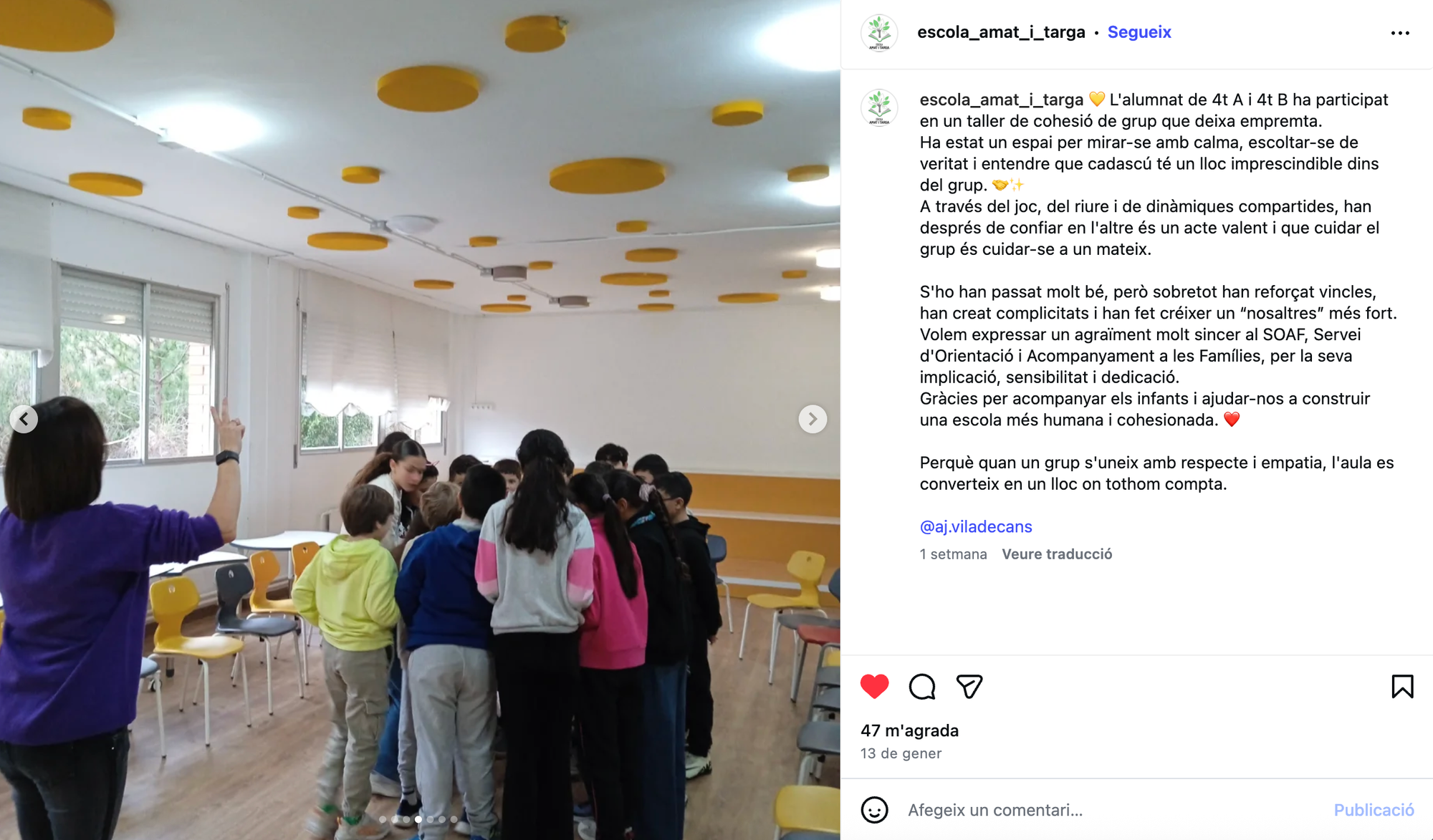 CURS 2025-26: - Taller "Cervells en acció! El joc que et fa més savi" a 2n de primària. Escola Miquel Martí i Pol de Viladecans (20/1/26) - Tallers familiar del concert "Pica-so" de l'Auditori de Barcelona (17 i 18/1/26) i concerts familiars (24 i 25/1/26) - Taller de cohesió de grup i reforç de competències emocionals a 4t de prim. Escola Amat i Targa de Viladecans (13/1/26). https://www.instagram.com/p/DTcqcSODTxa/?utm_source=ig_web_copy_link&igsh=MzRlODBiNWFlZA== - Taller Educació emocional a 4rt de primària. Escola GOAR Viladecans. (2/12/25) - Taller Educació emocional i cohesió de grup a 2n de primària. Escola Dr.Trueta Viladecans (25/11/25) - Tutories TFM Màster d'Educació Emocional UB (octubre 25-juliol 26) - Taller Educació emocional contra els rumors a 6è primària. Escola Dr.Trueta Viladecans (18/11/25) - Formació a l'equip de l'Espai Emocional A Viladecans Salut Emocional. (31/10/25 i 14/11/25) - Taller per a l'alumnat. Escola Marcel·lí Moragas Gavà (28/10/25) - La Cultivadora. Tallers de música i emoció per a docents de Tarragona (25/10) i Berga (29/11). - Microcredencial UAB “L'aula de música al context educatiu actual”. Mòdul Música i emoció. Compartida amb grans professionals deducació inclusiva, de gènere i comunitària. (Octubre 25) Informació microcredencial - Dinamització de la ruta "Viladecans, compromís amb la primera infància i les vostres famílies" al XVII Congrés Estatal de la RECE (xarxa estatal de ciutats educadors). (2/10/25)